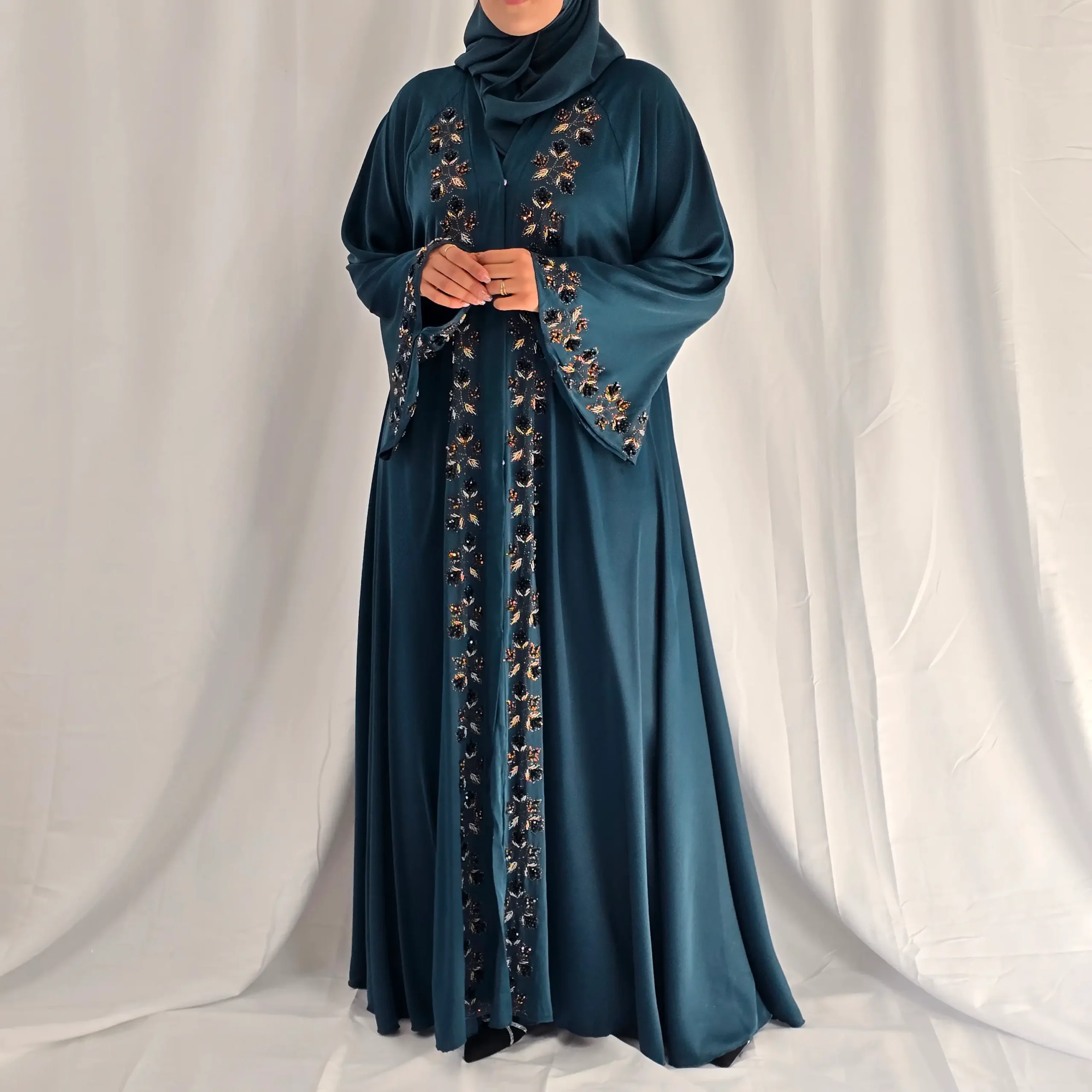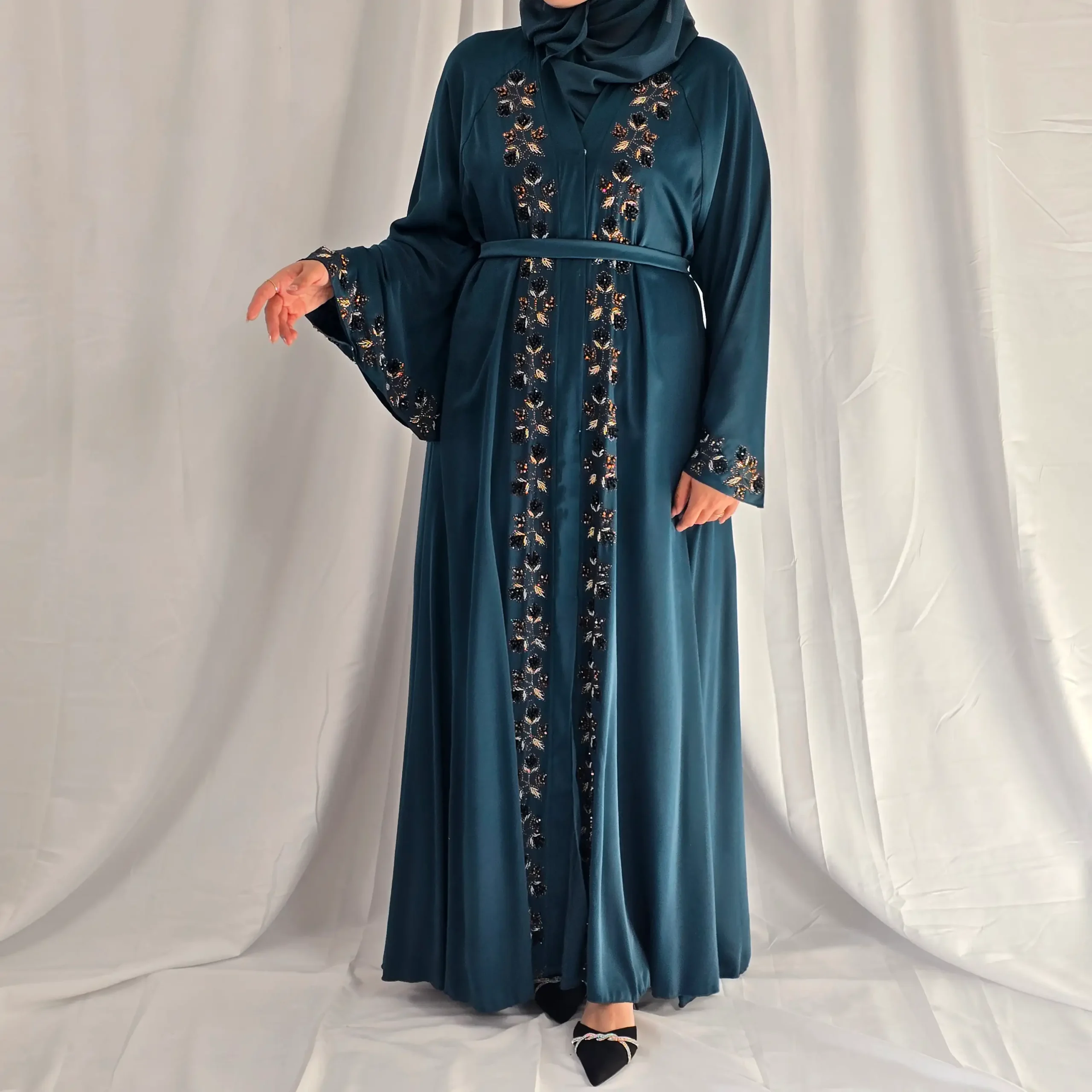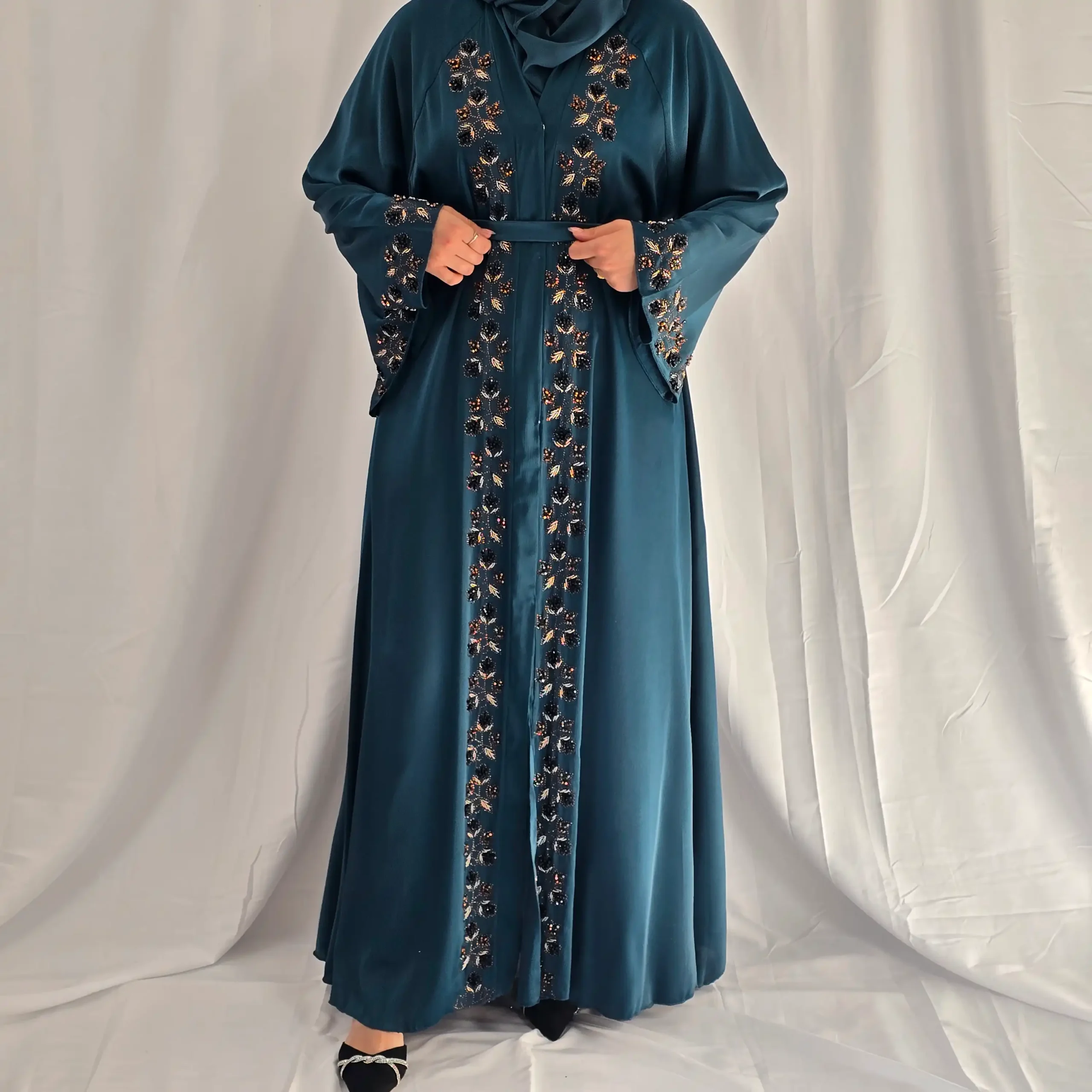 Abaya cloche verte canard à strass et perles – élégance traditionnelle