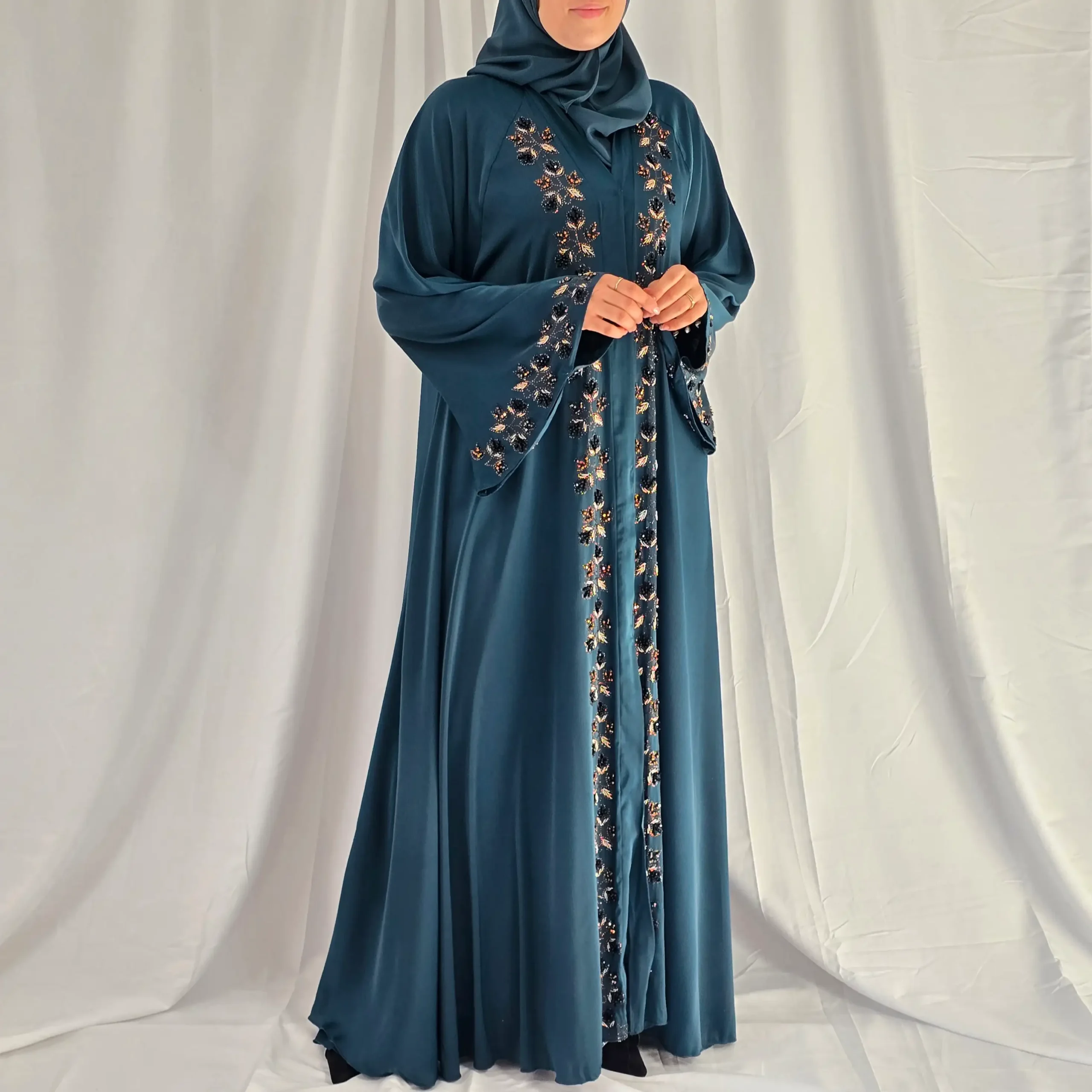 Les broderies de cette abaya sont réalisées avec précision. Elles combinent perles et strass pour créer un éclat délicat. Ces détails scintillent subtilement à la lumière, sans jamais alourdir la pièce. Grâce à cet équilibre, la tenue conserve une apparence harmonieuse. Elle devient alors idéale pour celles qui recherchent une abaya sophistiquée mais discrète.