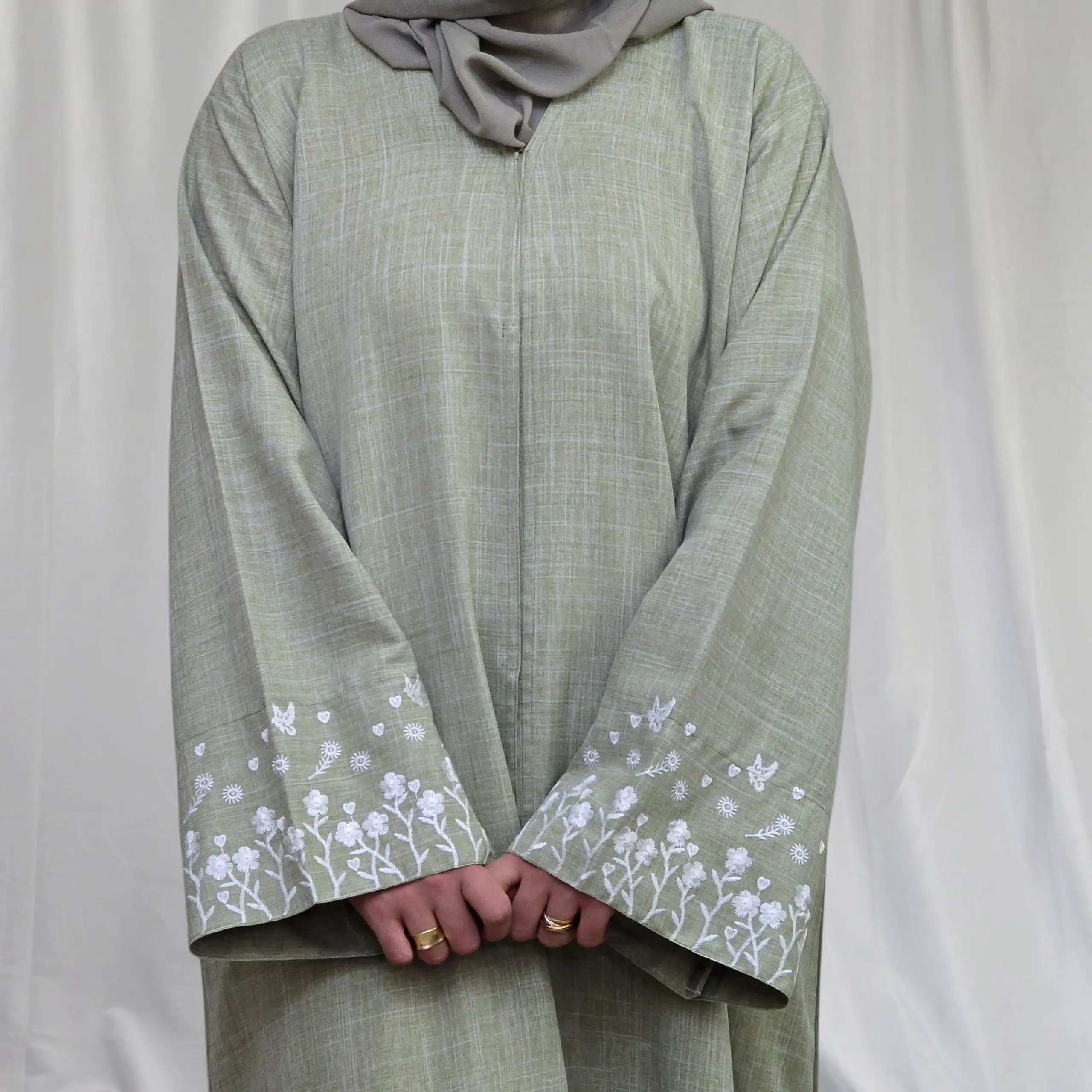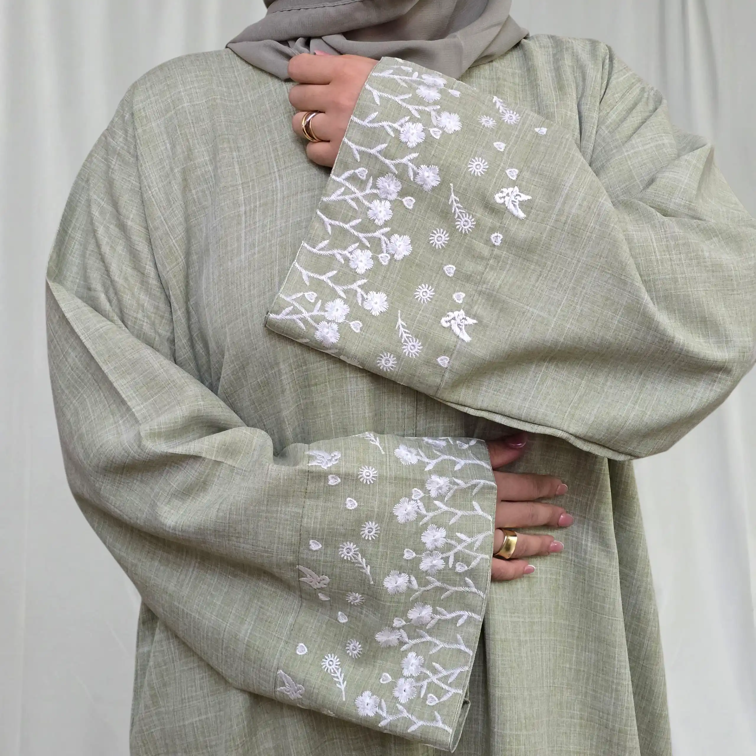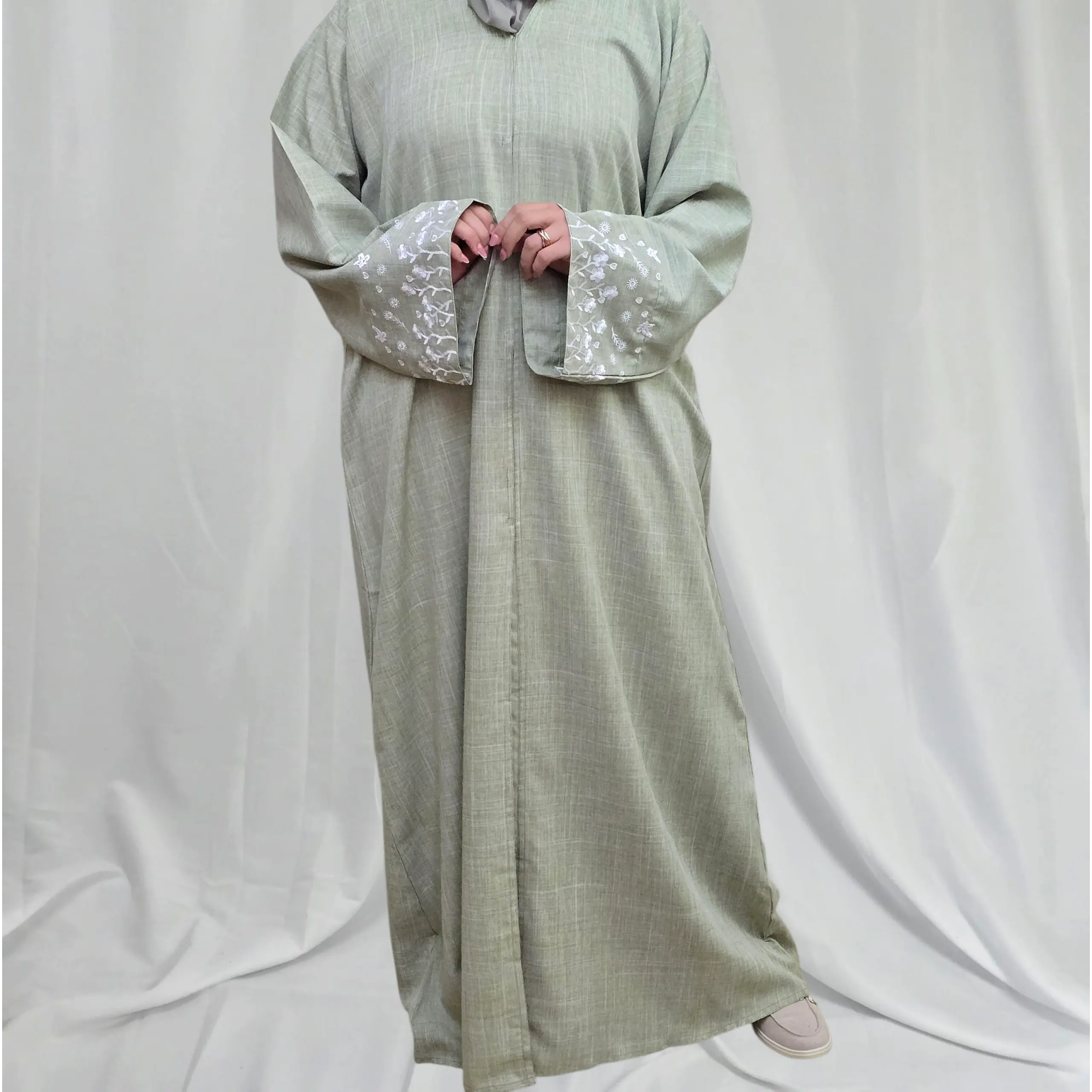 Caractéristiques de la Linen Abaya Vert Sauge à Manches Brodées