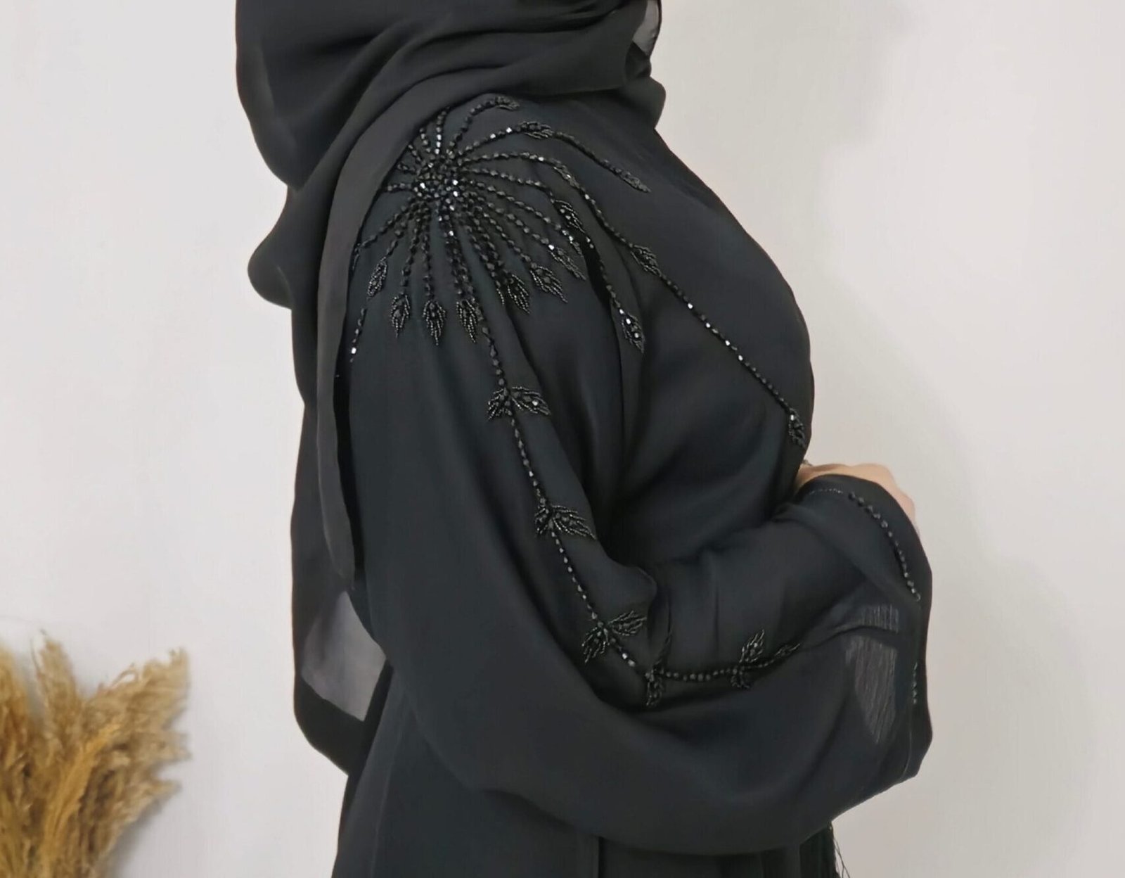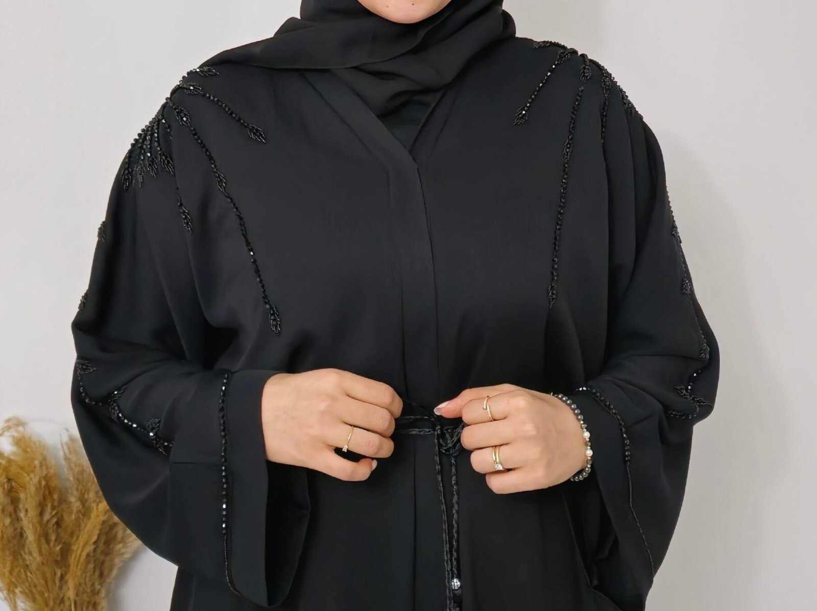 Ce qui distingue cette abaya, c’est son travail artisanal minutieux. Les perles noires cousues à la main ornent délicatement les épaules et les manches, formant des motifs discrets mais sophistiqués. Grâce à ces détails, chaque mouvement capte subtilement la lumière, tout en conservant une élégance discrète et féminine.
