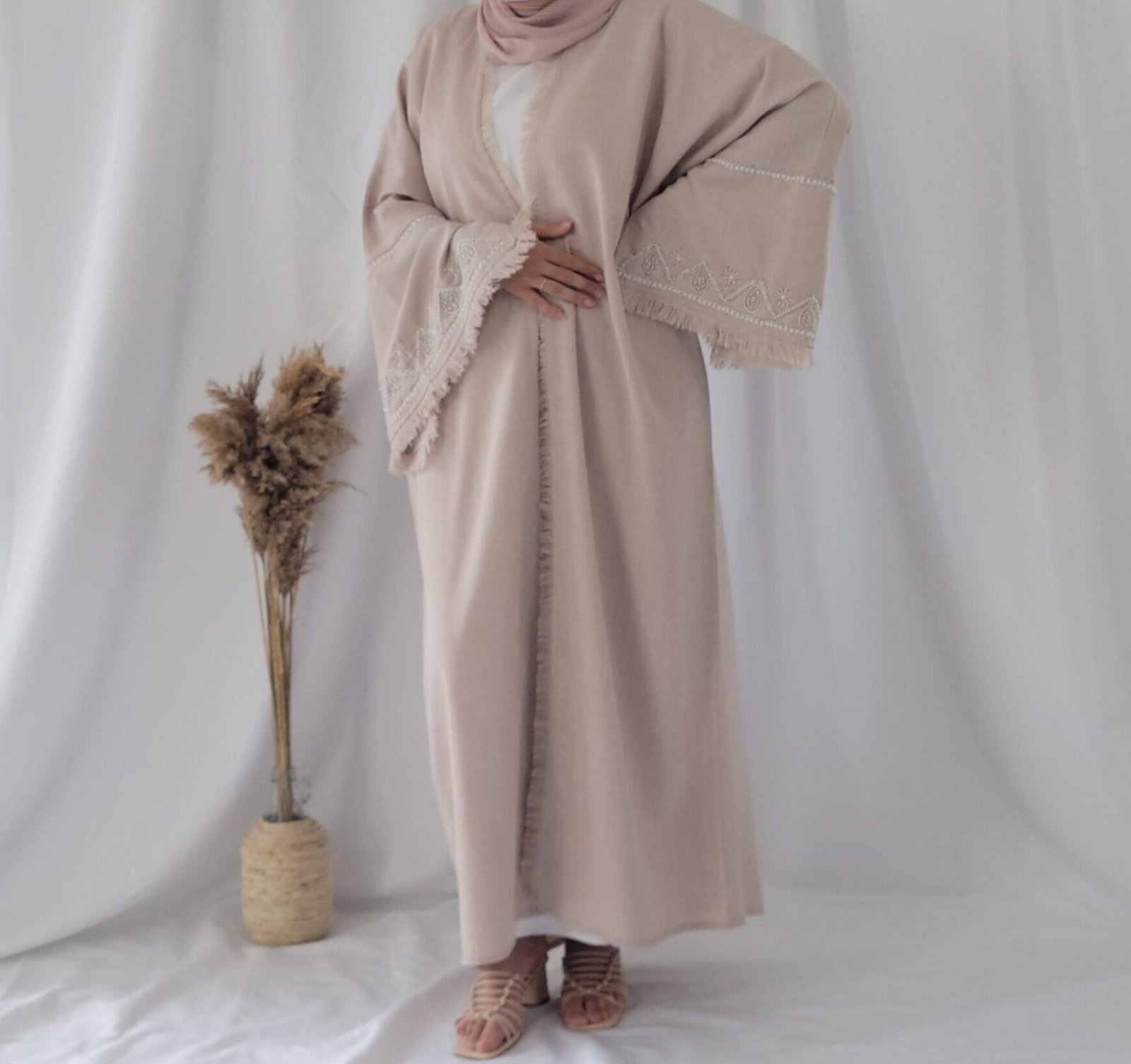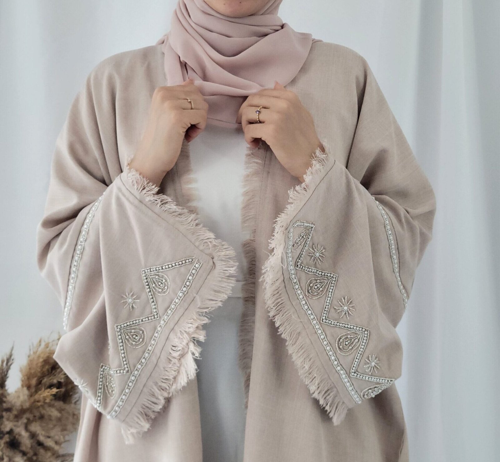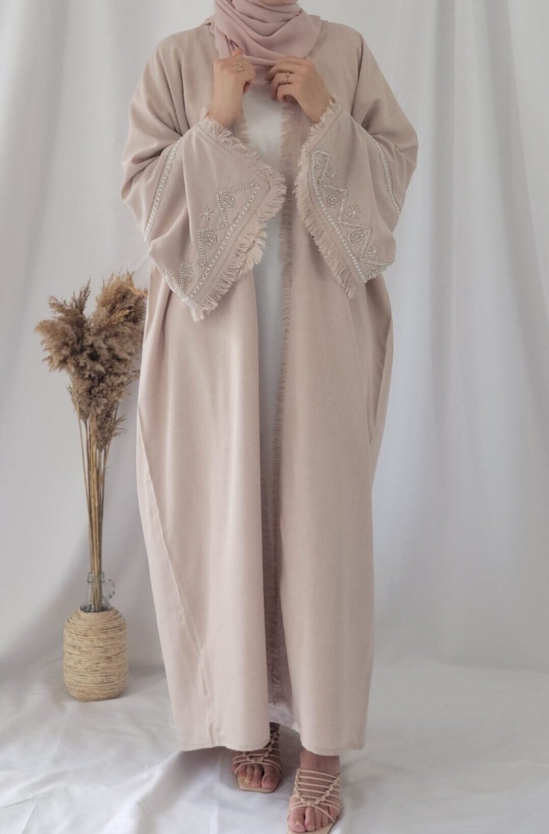 Linen Abaya Kimono élégante - Mode féminine chez RehamStore.frLinen abaya kimono beige à franges et manches perlées