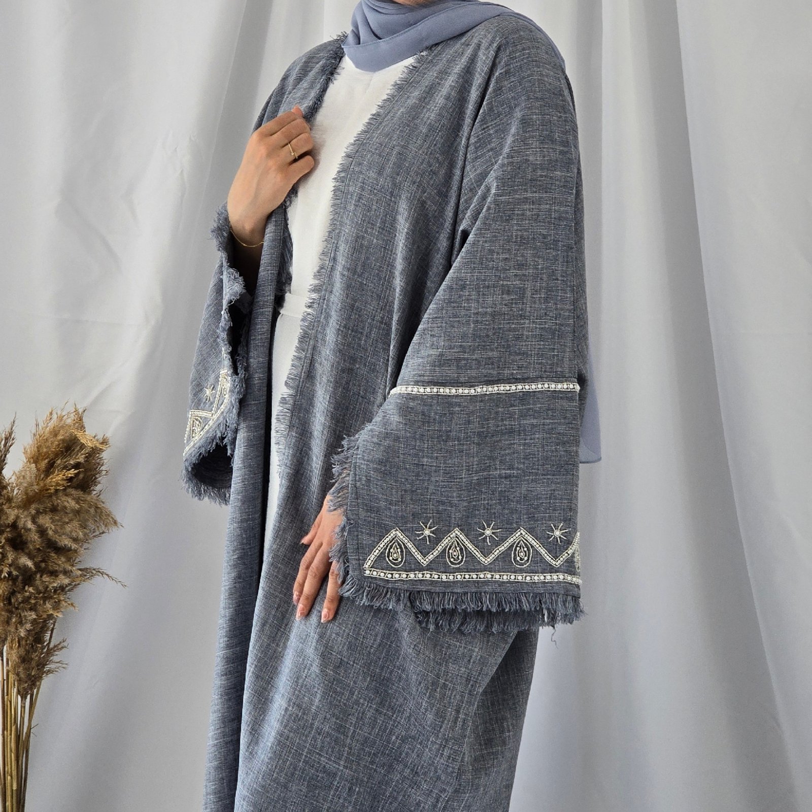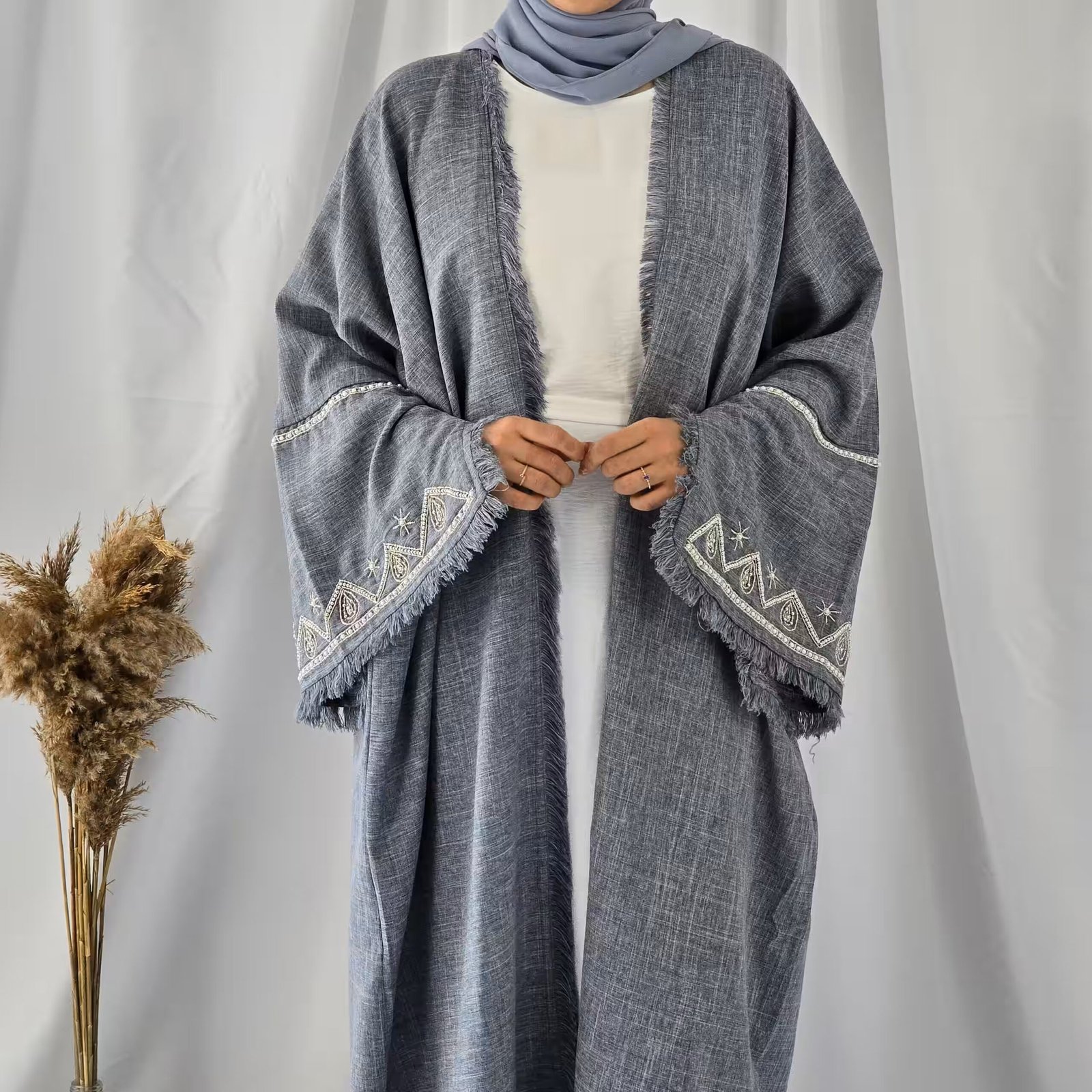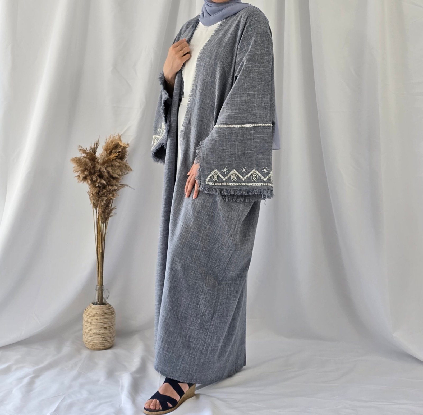 Linen abaya kimono grise à franges et manches perléesLinen abaya kimono grise à franges et manches perlées